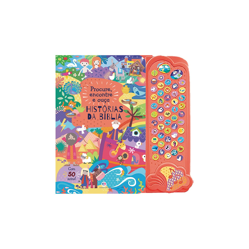 Procure e encontre muitas imagens de histórias da Bíblia e ouça mais de 50 sons neste livro divertido. E não se preocupe: se a bateria acabar, é só trocar e a diversão continua sem parar!
