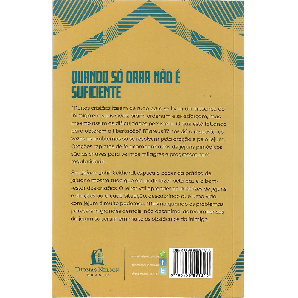 Quando só orar não é suficiente Muitos cristãos fazem de tudo para se livrar da presença do inimigo em suas vidas: oram, ordenam e se esforçam, mas mesmo assim as dificuldades persistem. O que está faltando para obterem a libertação? Mateus 17 nos dá a resposta: às vezes os problemas só se resolvem pela oração e pelo jejum. Orações repletas de fé acompanhadas de jejuns periódicos são as chaves para vermos milagres e progressos com regularidade. Em Jejum, John Eckhardt explica o poder da prática de jejuar e mostra tudo que ela pode fazer pela paz e o bem-estar dos cristãos.
