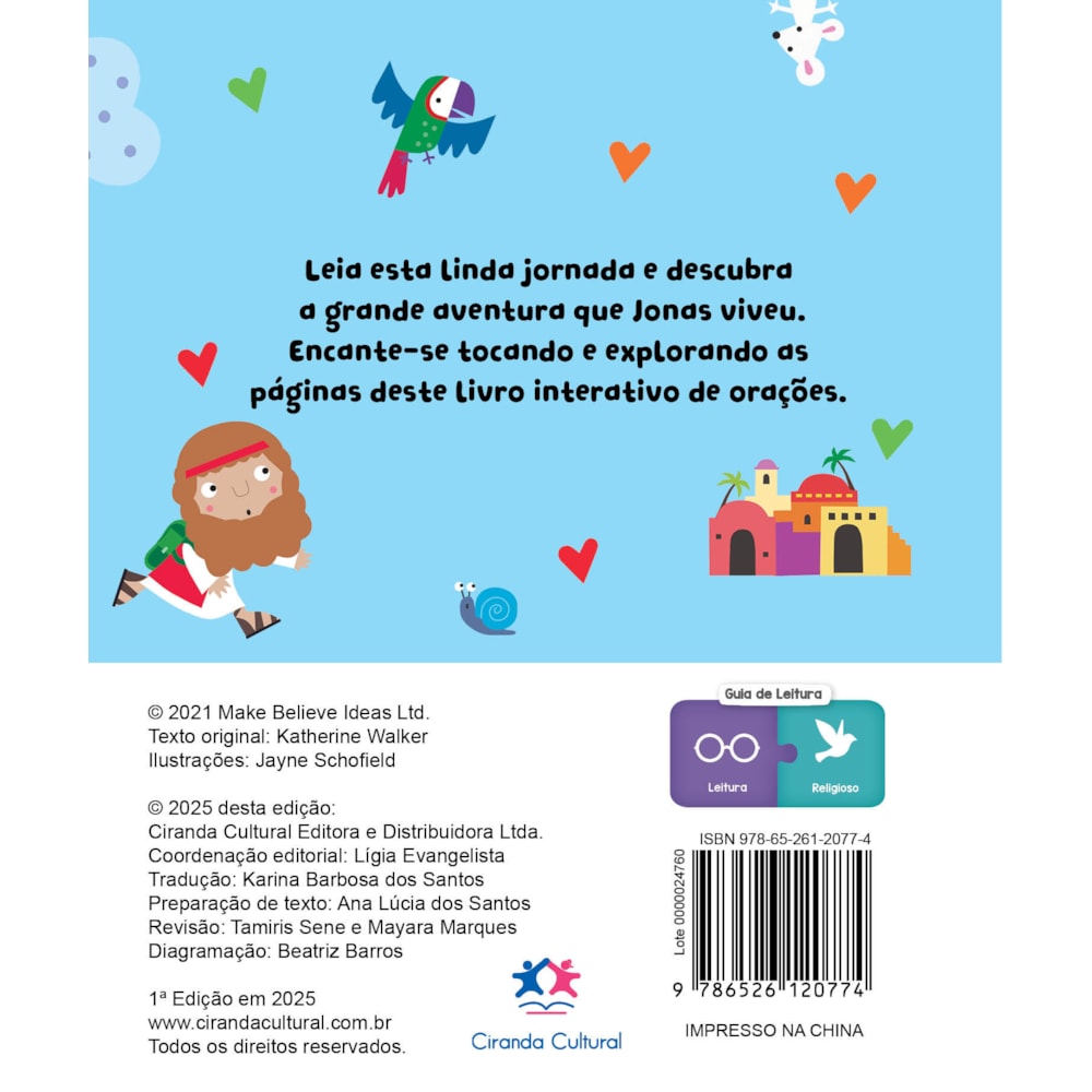 Junte-se a Jonas em uma jornada importante enquanto ele é jogado de um barco e engolido por um peixe grande! Este livro emocionante tem uma oração para compartilhar e toques divertidos para explorar. Ah... e ainda seu pequeno pode levar para onde quiser, pois possui uma alça como uma maleta ou seja são histórias bíblicas com alça!