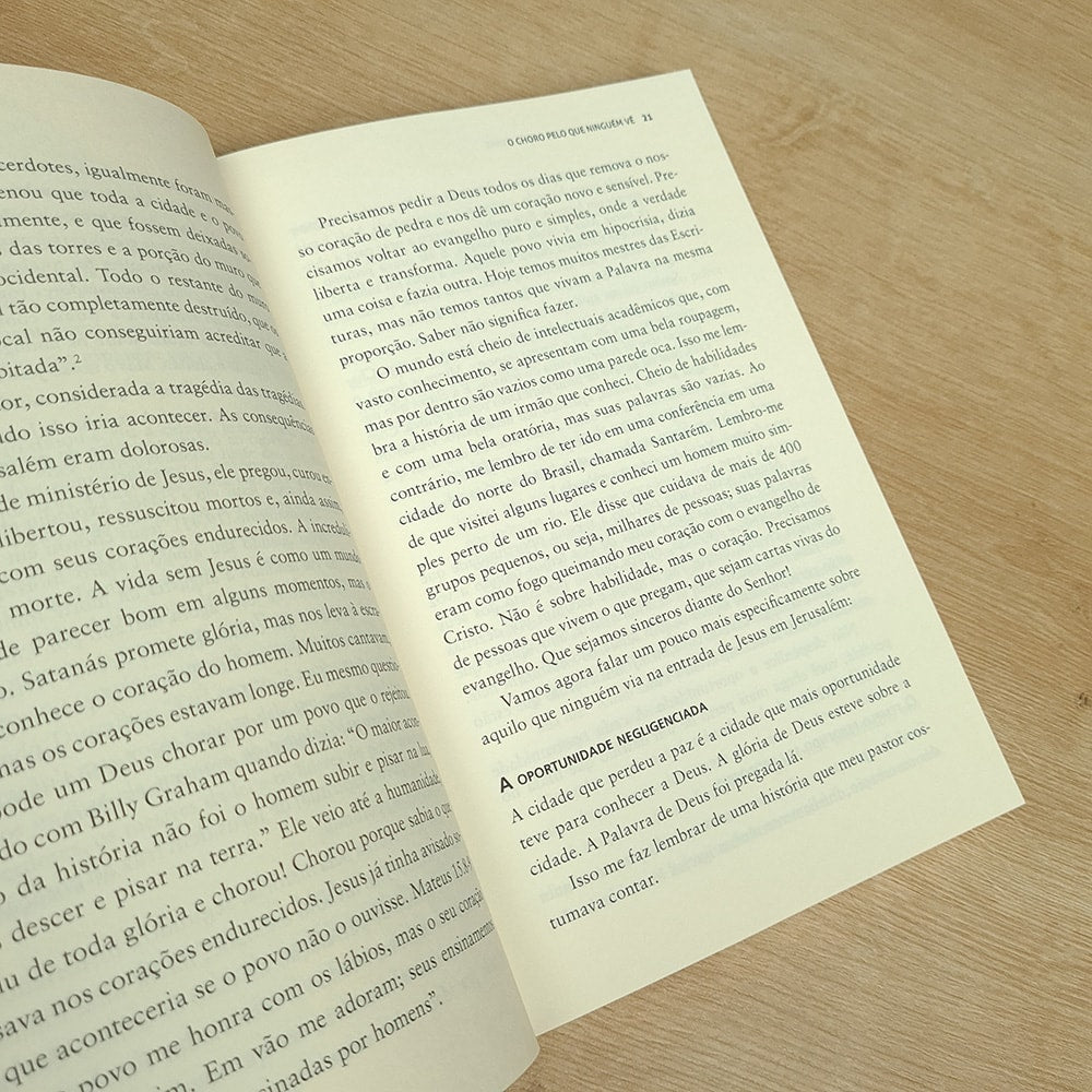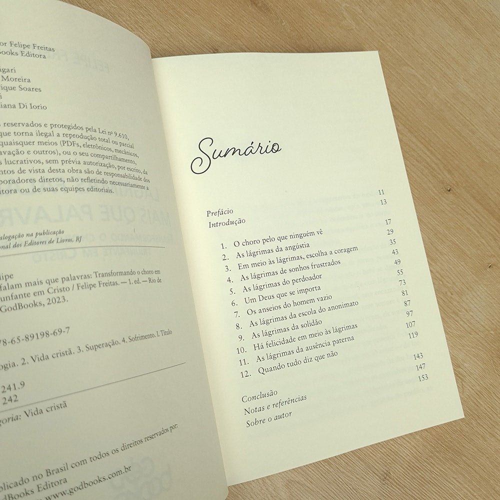 Este livro avança em esquadrinhar o que provoca o choro, os tipos de choro e as lições de cada choro. O autor — de forma nobre e profunda — retrata a profundidade da dor humana diante dos desafios da vida, elencando os caminhos para se ressignificar o choro que ninguém vê, as lágrimas da angústia, as lágrimas dos sonhos frutados, as lágrimas do perdão, as lágrimas anônimas e solitárias, as lágrimas da ausência paterna e as lágrimas das situações insolúveis.