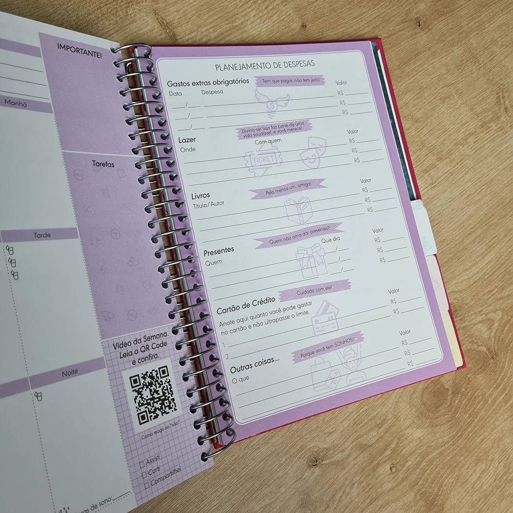 Este planner contém temas como finanças, empreendedorismo e desenvolvimento pessoal. Ele oferece testes, análises, dicas e técnicas para ajudar você nesse processo diário, desafiador e empolgante. Tudo isso para que sua vida flua melhor, com propósito e qualidade, levando-a a viver um ano incrível.
