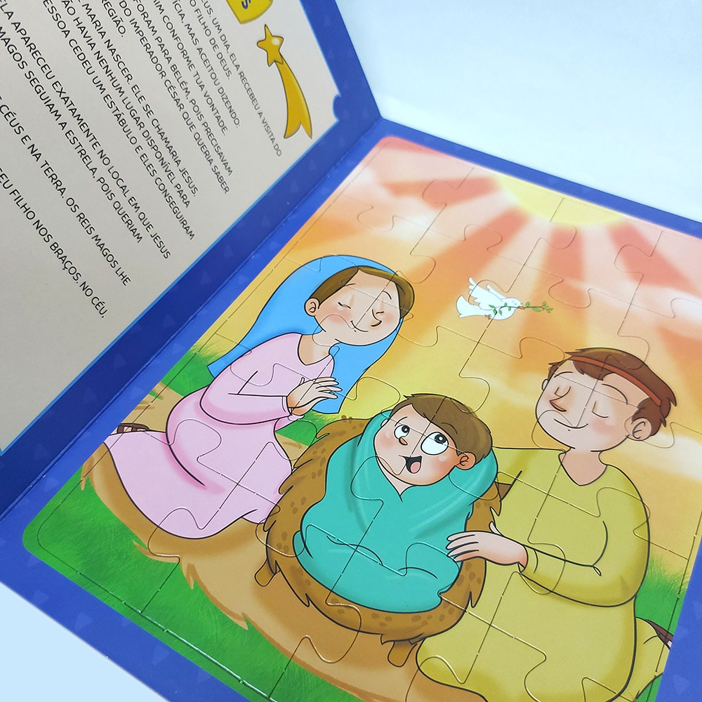 Leia lindas histórias bíblicas como A criação do mundo, O nascimento de Jesus, Os 10 mandamentos e A arca de Noé, e ainda divirta-se montando 4 belos quebra-cabeças.