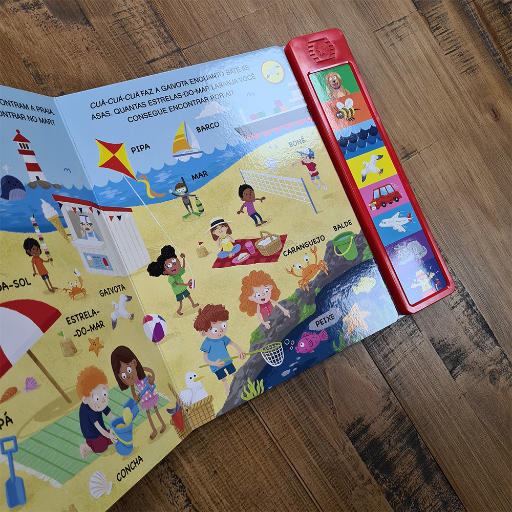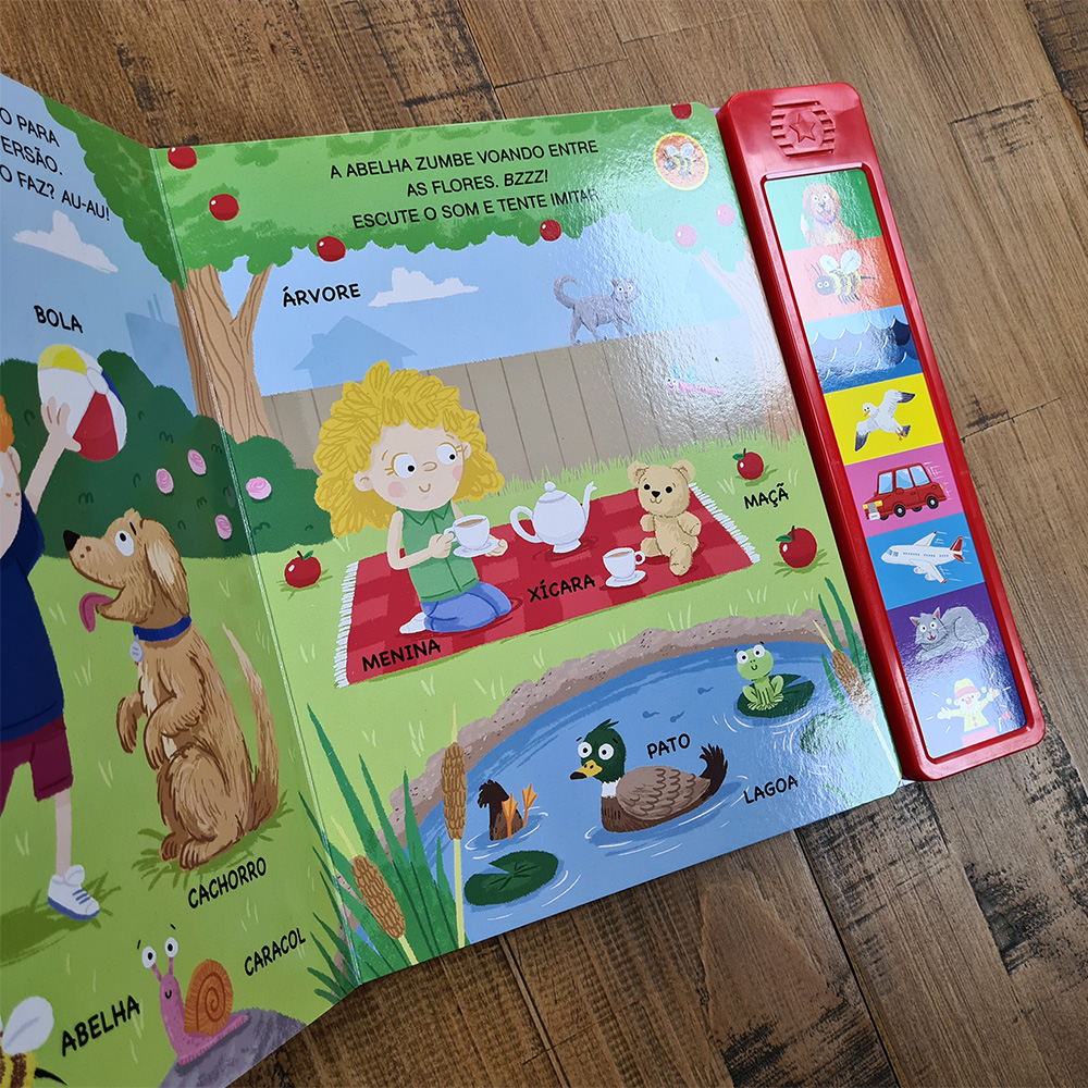 "Explore o mundo ao seu redor apertando os botões para ouvir os sons incríveis da praia, cidade, jardim e casa! Este livro interativo da Ciranda Cultural apresenta 8 sons envolventes, incluindo abelha, cachorro, avião, carro, mar, gato, palhaço e gaivota. Uma experiência cativante que combina aprendizado e diversão. Leia, escute e deixe as crianças se encantarem com essa jornada sonora única!