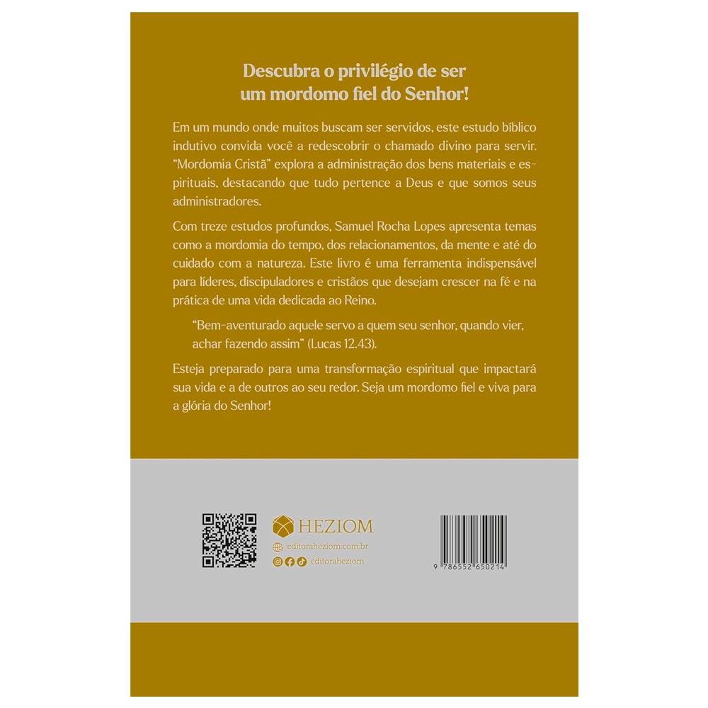 Numa sociedade que valoriza o "eu" acima de tudo, este estudo bíblico indutivo apresenta um contraponto transformador: o chamado cristão à mordomia fiel. Revelando que nada nos pertence - nem tempo, talentos ou recursos - esta obra convida a uma revolução de prioridades onde Deus ocupa Seu lugar legítimo: o primeiro.
