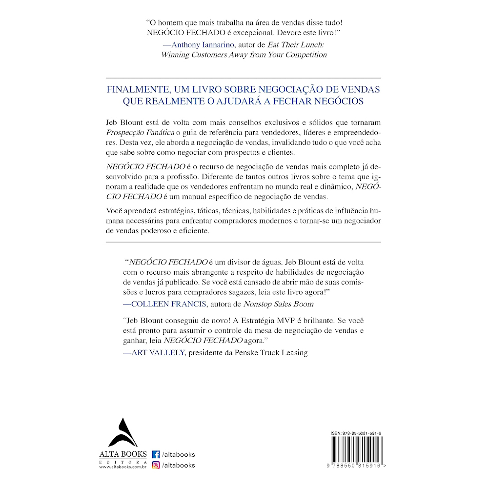 Jeb Blount está de volta com mais conselhos exclusivos e sólidos que tornaram Prospecção Fanática o guia de referência para vendedores, líderes e empreendedores. Desta vez, ele aborda a negociação de vendas, invalidando tudo o que você acha que sabe sobre como negociar com prospectos e clientes. NEGÓCIO FECHADO é o recurso de negociação de vendas mais completo já desenvolvido para a profissão.