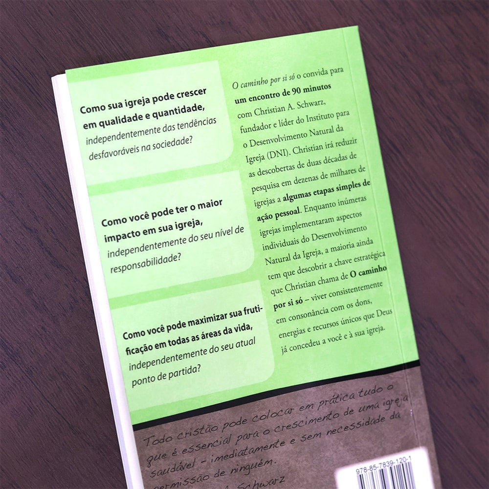 Christian irá reduzir as descobertas de duas décadas de pesquisa em dezenas de milhares de igrejas a algumas etapas simples de ação pessoal. Enquanto inúmeras igrejas implementaram aspectos individuais do DNI, a maioria ainda tem que descobrir a chave estratégica que Christian chama de O Caminho Por Si Só - viver consistentemente em consonância com os dons, energias e recursos únicos que Deus já concedeu a você e à sua igreja. "Todo cristão pode colocar em prática tudo o que é essencial para o crescimento de uma igreja saudável - imediatamente e sem necessidade da permissão de ninguém". Christian A. Schwarz