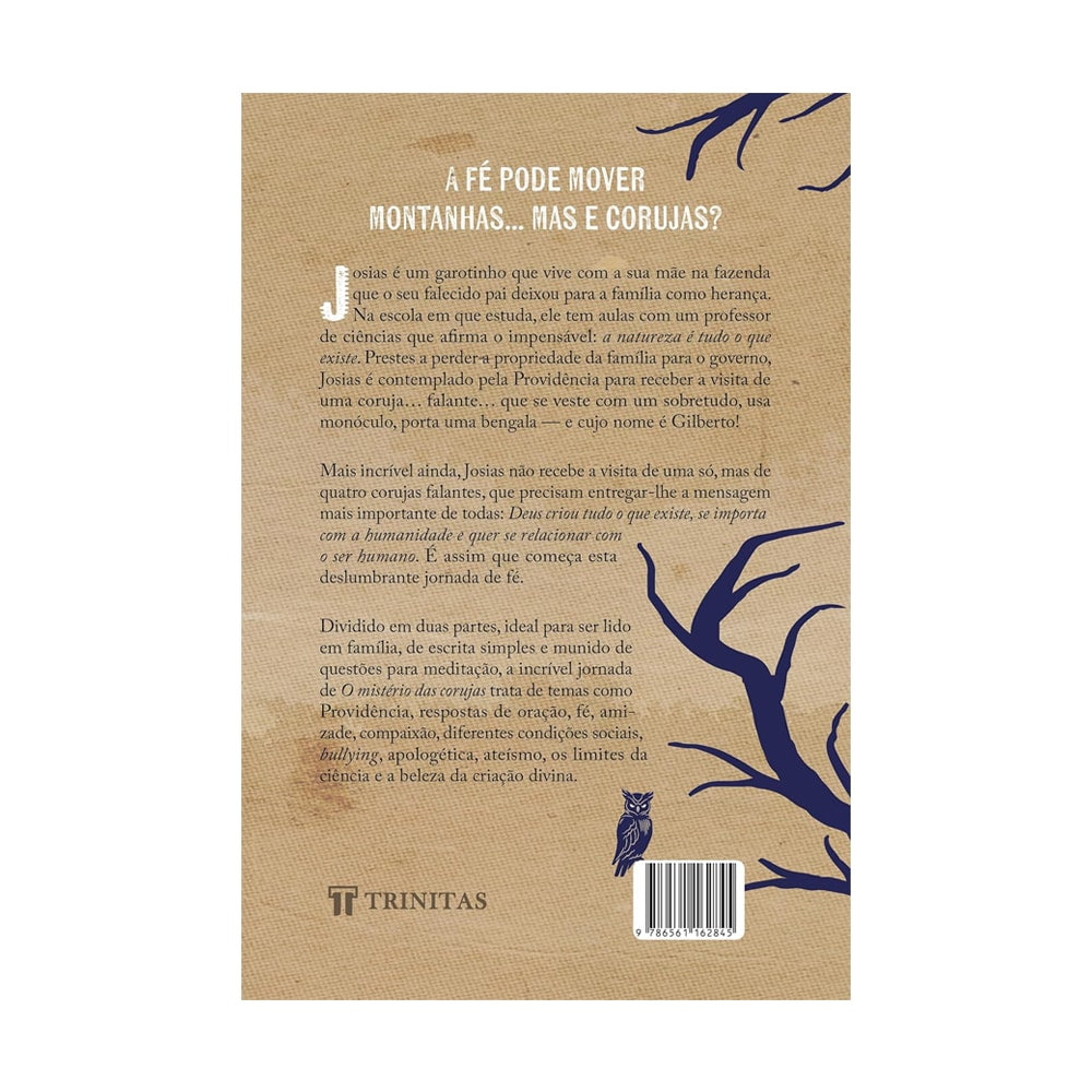 Em O Mistério das Corujas: Uma Aventura de Fé, Josias, após a perda do pai, encontra consolo nas histórias familiares, especialmente a que conta como corujas falantes salvaram seus ancestrais. Quando a história se torna realidade e corujas misteriosas aparecem, Josias embarca em uma jornada que testará sua fé, coragem e amizade. Acompanhado de suspense e reviravoltas, o livro explora temas como Providência, oração, amizade, bullying, ciência e a beleza da criação divina. Uma leitura inspiradora, ideal para toda a família, que revela como a fé pode guiar nos momentos mais difíceis.