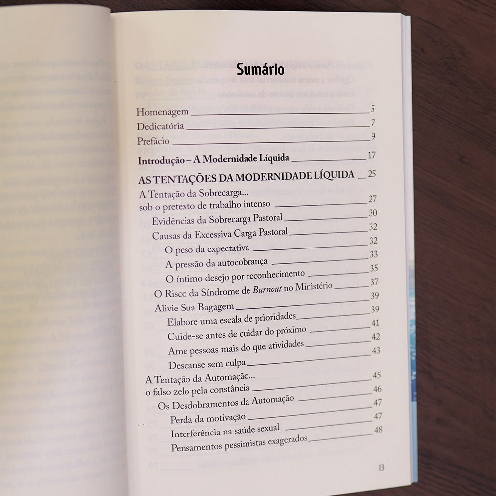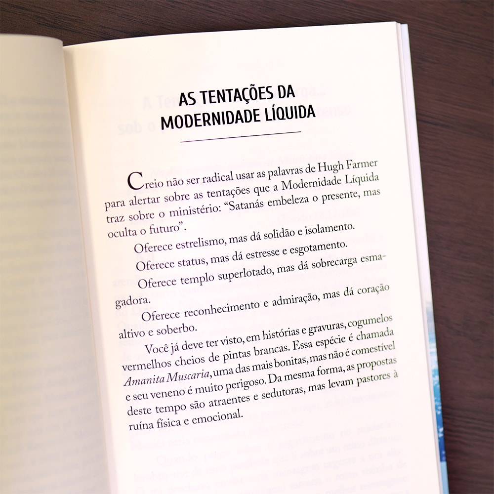 Hoje, na era que Zygmunt Bauman denomina Modernidade Líquida, o pastor é semanalmente cobrado a ser: - Empreendedor visionário; - Orador da melhor estirpe; - Exímio conselheiro; - Visitador incansável; - Educador de excelente qualidade; - Administrador de conflitos; - Ilibado exemplo de pai e esposo; - Psicólogo; - Terapeuta... Como sobreviver a essa avalanche de responsabilidades? Como se prevenir das tentações da Modernidade Líquida e dar segurança e longevidade ao ministério? Como evitar se tornar parte do crescente número de pastores em depressão e doenças da alma?"