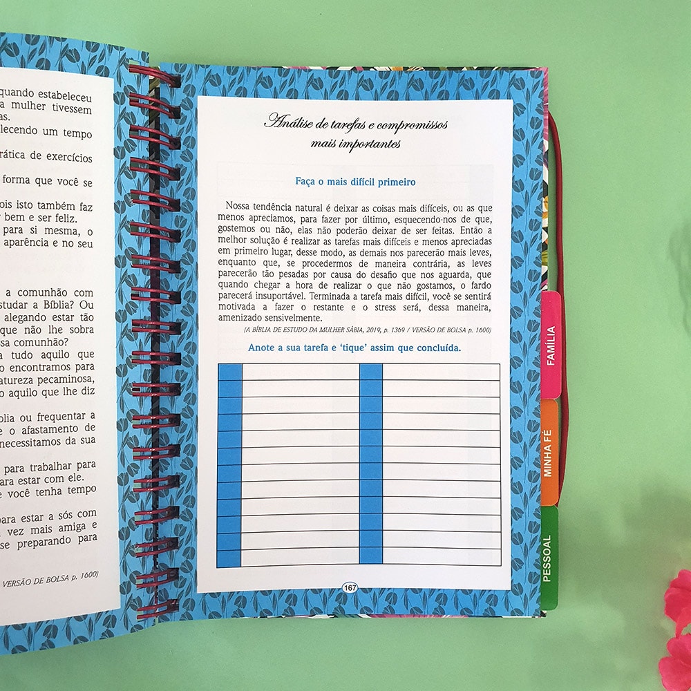 O Planner foi desenvolvido baseado na "Bíblia da Mulher Sábia", perfeito para todas as mulheres que gostam de ter uma organização mensal ou semanal. Com o design floral e feminino tem capa dura no formato em espiral.