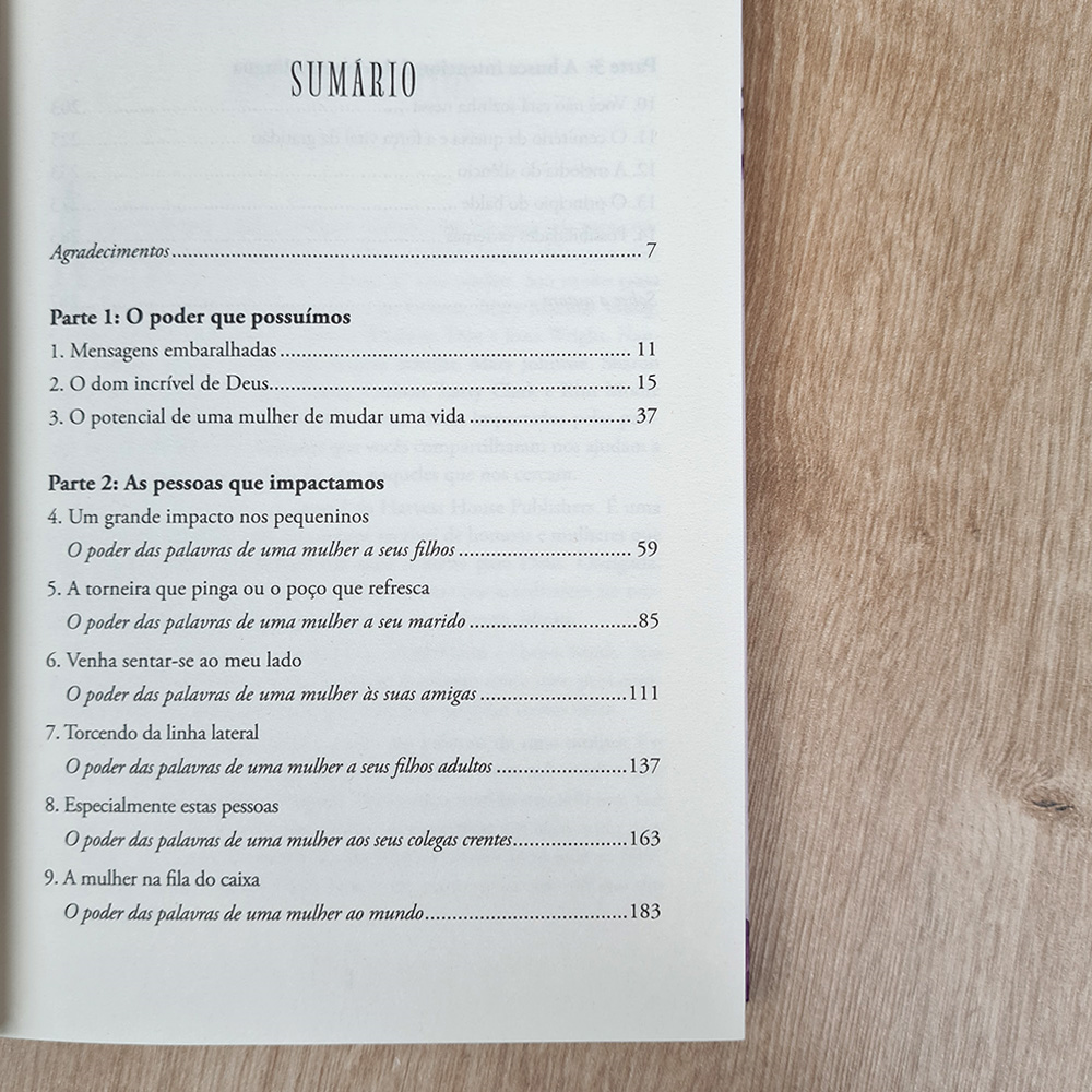As palavras são uma das forças mais poderosas do universo, e Deus confiou esse poder a cada uma de nós! Você sabia que suas palavras podem ser benção ou maldição; podem erguer ou derrubar; podem alegrar ou entristecer; podem vivificar a alma ou mortificar o que resta de vida nela. Como você pretende usar esse dom poderoso? Em O poder das palavras de uma mulher, a premiada autora best-seller Sharon Jaynes mostra à leitora como: - Trocar palavras inapropriadas que magoam por palavras cuidadosas que auxiliam o próximo a ser feliz e bem-sucedido. - Reconhecer palavras que ergam muralhas sólidas de esperança e convicção. - Superar a negatividade que afasta as pessoas e se tornar um poço de positividade que atrai os outros. - Domar a língua adotando princípios práticos que ajudam a pensar duas vezes antes de falar. - Ter autocontrole e tomar posso do poder do Espírito Santo. Este livro é um poderoso recurso espiritual para todas as mulheres que buscam desenvolvimento pessoal e que desejam ser um canal de bênção onde quer que estejam.