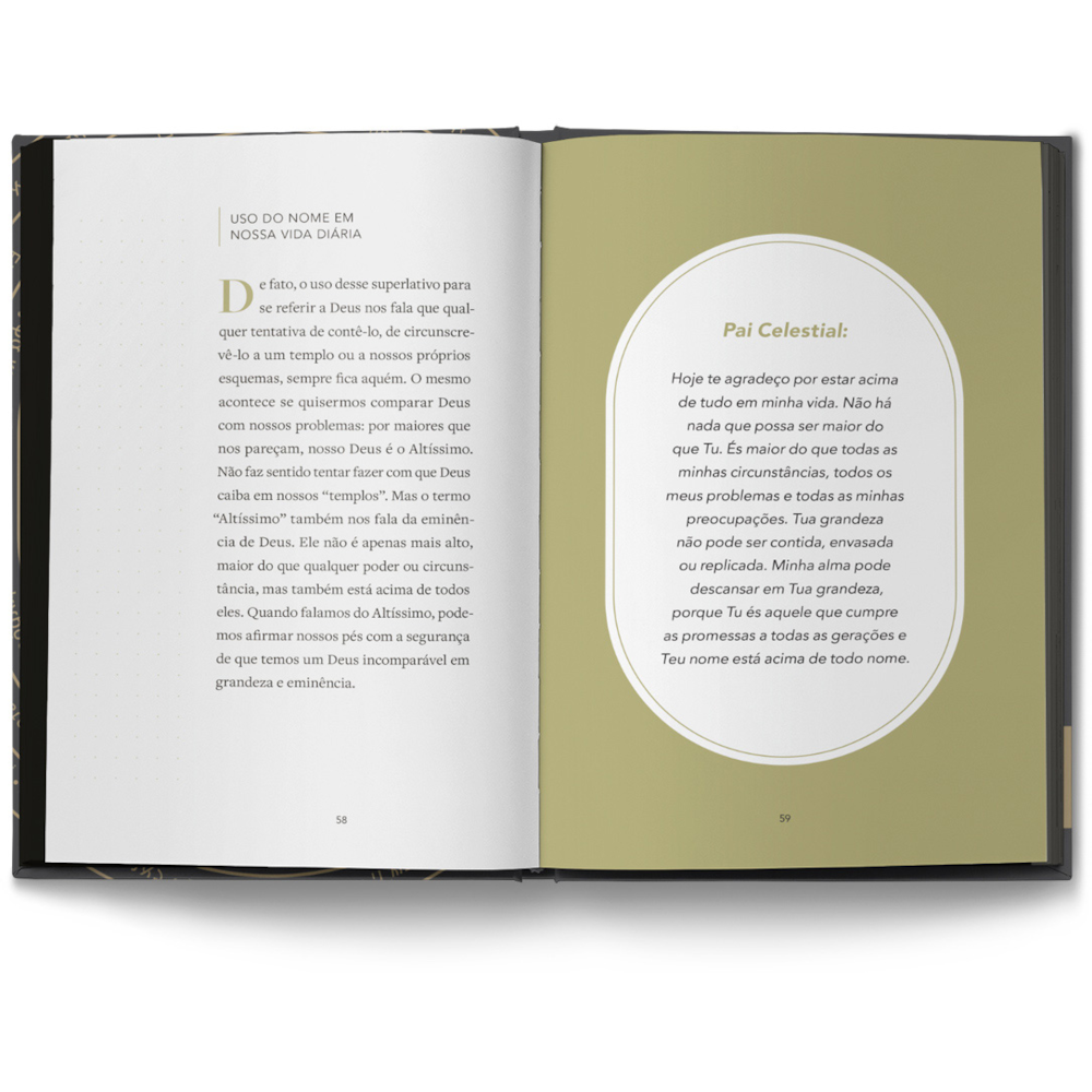 Com um conteúdo pleno, o livro aborda o nome na língua e alfabeto originais (hebraico e grego), a transliteração fonética, o nome em português, seu sentido, passagens bíblicas onde o nome ocorre e, por fim, uma oração sensível e com poder para reconhecermos o quão grande é o nosso Deus.