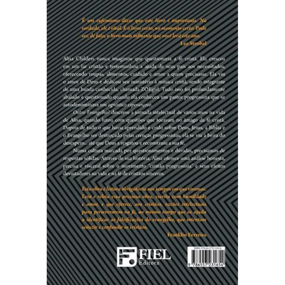 Tudo isso foi profundamente abalado e questionado quando ela conheceu um pastor progressista que se autodenominava um agnóstico esperançoso. Outro Evangelho? descreve a jornada intelectual de vários anos na vida de Alisa, quando lutou com questões que tocavam no âmago da fé cristã. Depois de tudo o que havia aprendido e crido sobre Deus, Jesus, a Bíblia e o Evangelho ser destroçado pelas crenças progressistas, ela se viu à beira do desespero... até que Deus a resgatou e reconstruiu a sua fé.