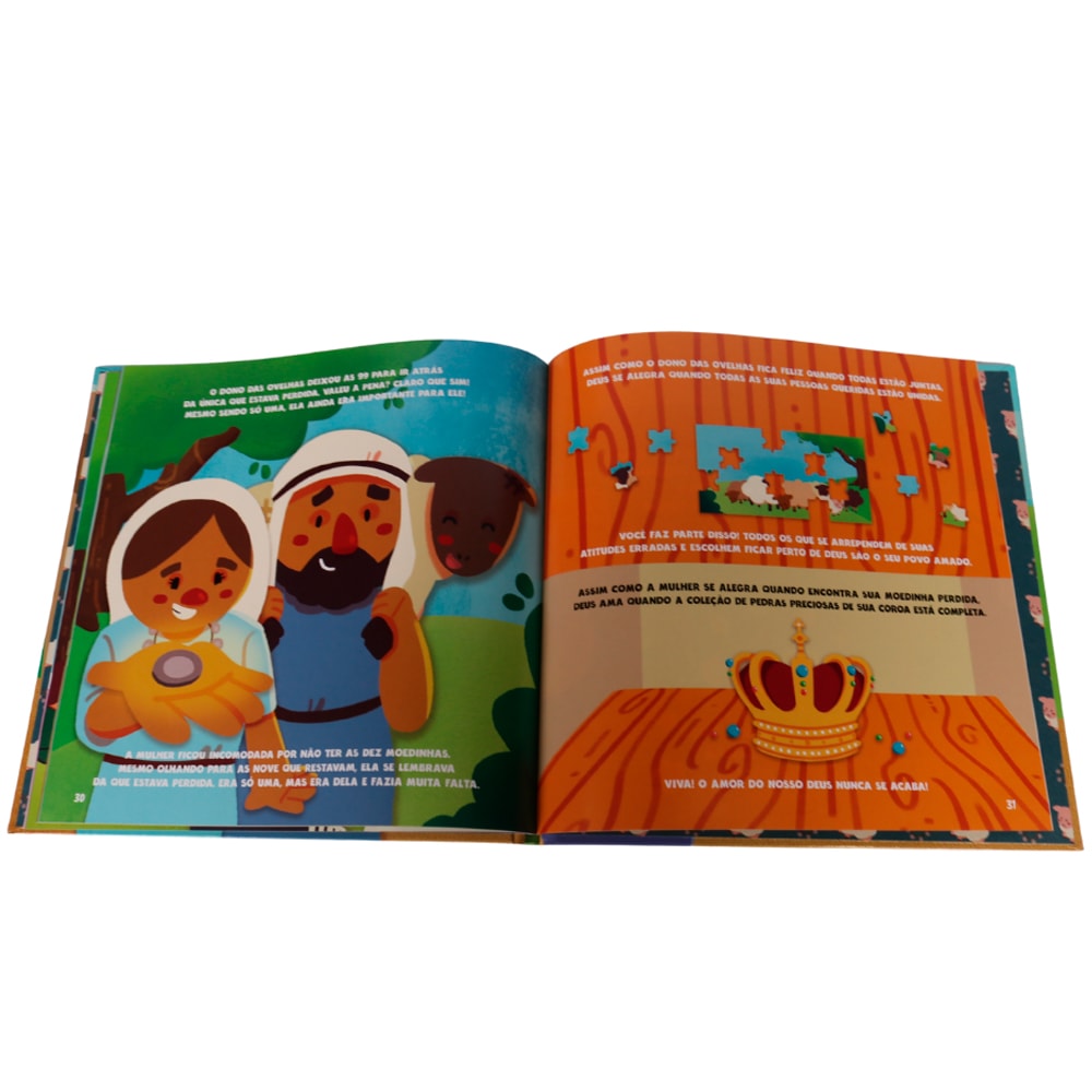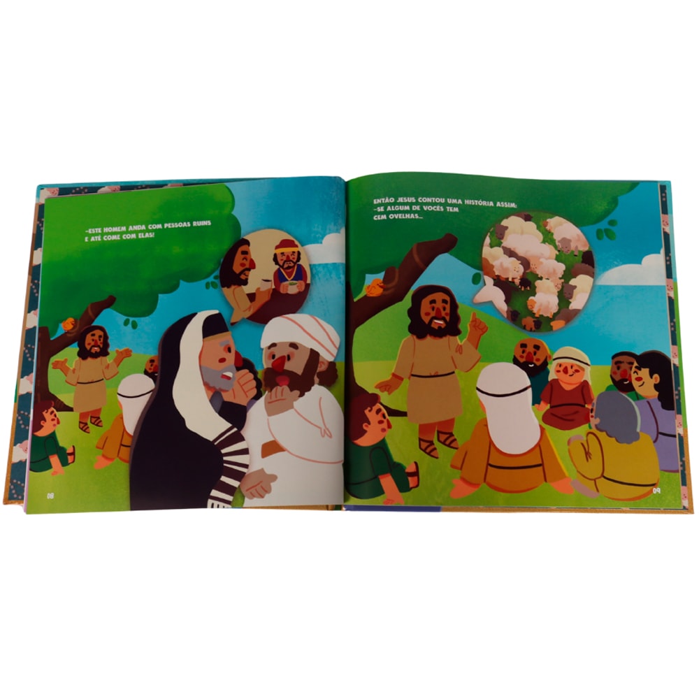 Este livro conta duas histórias famosas de jesus sobre ovelhas e moedas perdidas. O dono das ovelhas deixou tudo para procurar a que estava perdida até encontrá-la. A dona das moedas procurou bastante até achar a que estava faltando.