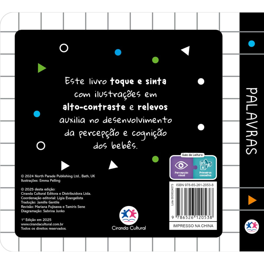 Com ilustrações de alto contraste e texturas em relevo para tocar e sentir, este livro de Palavras foi criado especialmente para encantar os leitores mais pequeninos desenvolvendo a percepção e cognição!