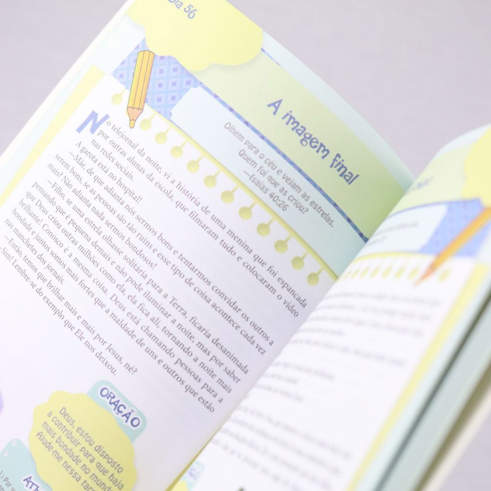 Pão Diário Kids Escolar Esta é uma edição especial do Pão Diário KIDS que traz o tema Escolar. As meditações selecionadas, do devocional anual, tratam especificamente de dilemas típicos que fazem parte do ambiente escolar. Contém atividades e espaço para anotações, sendo um excelente recurso para orientar a criança sobre o que é esperado dela na escola. São 80 histórias e 30 atividades.