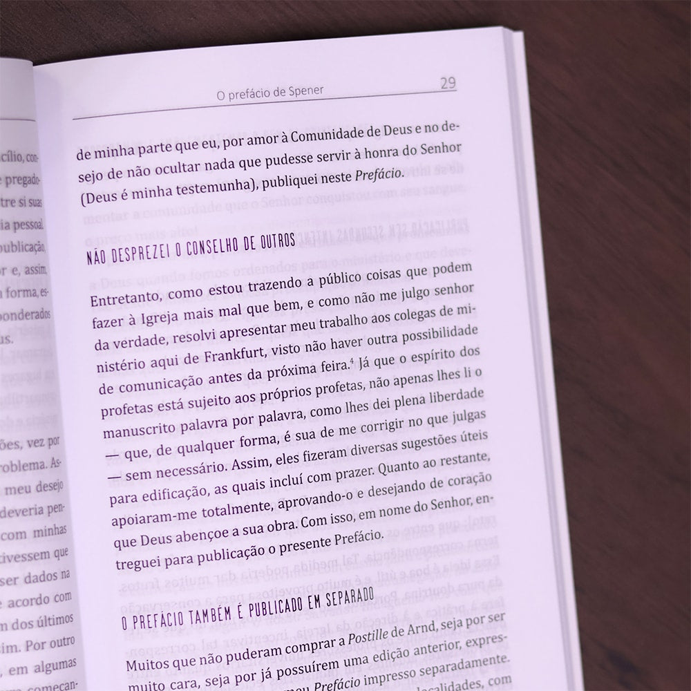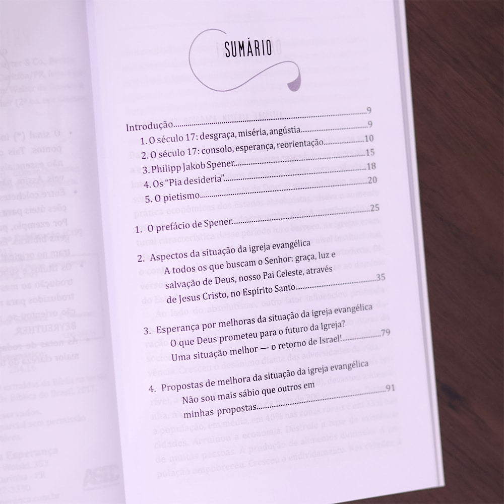 Seu manuscrito, Pia Desideria, é dividido em três partes e traz seis propostas específicas para mudar o futuro da Igreja, pois Spener constatou que nem sempre o “ensino correto” leva a uma “vida correta”. Sua visão profética deu início ao Movimento de Comunhão e Avivamento (conhecido como Pietismo), mostrando que a justificação pela fé deve ser seguida pela santificação pelo Espírito Santo, caso contrário tudo será apenas “fé inoperante”. Nestas páginas o leitor não encontrará apenas um documento histórico. Ao prepararmos esta edição, oramos para que todos sejamos contagiados por estas palavras e também experimentemos a revitalização espiritual prometida por Jesus Cristo.
