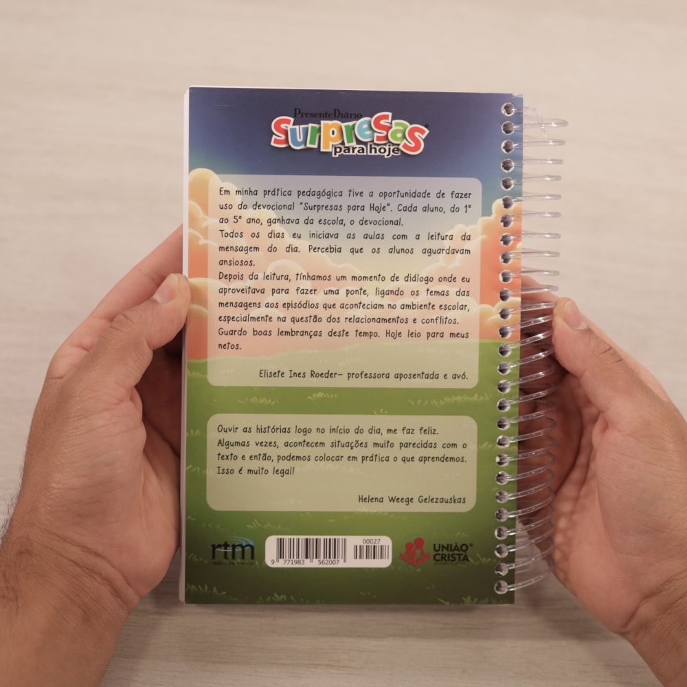 Em minha trajetória como educadora, tive a oportunidade de utilizar o devocional "Surpresas para Hoje", que era oferecido a todos os alunos do 1º ao 5º ano. Diariamente, começava as aulas com a leitura da mensagem do dia, e era gratificante ver a expectativa nos rostos dos alunos.