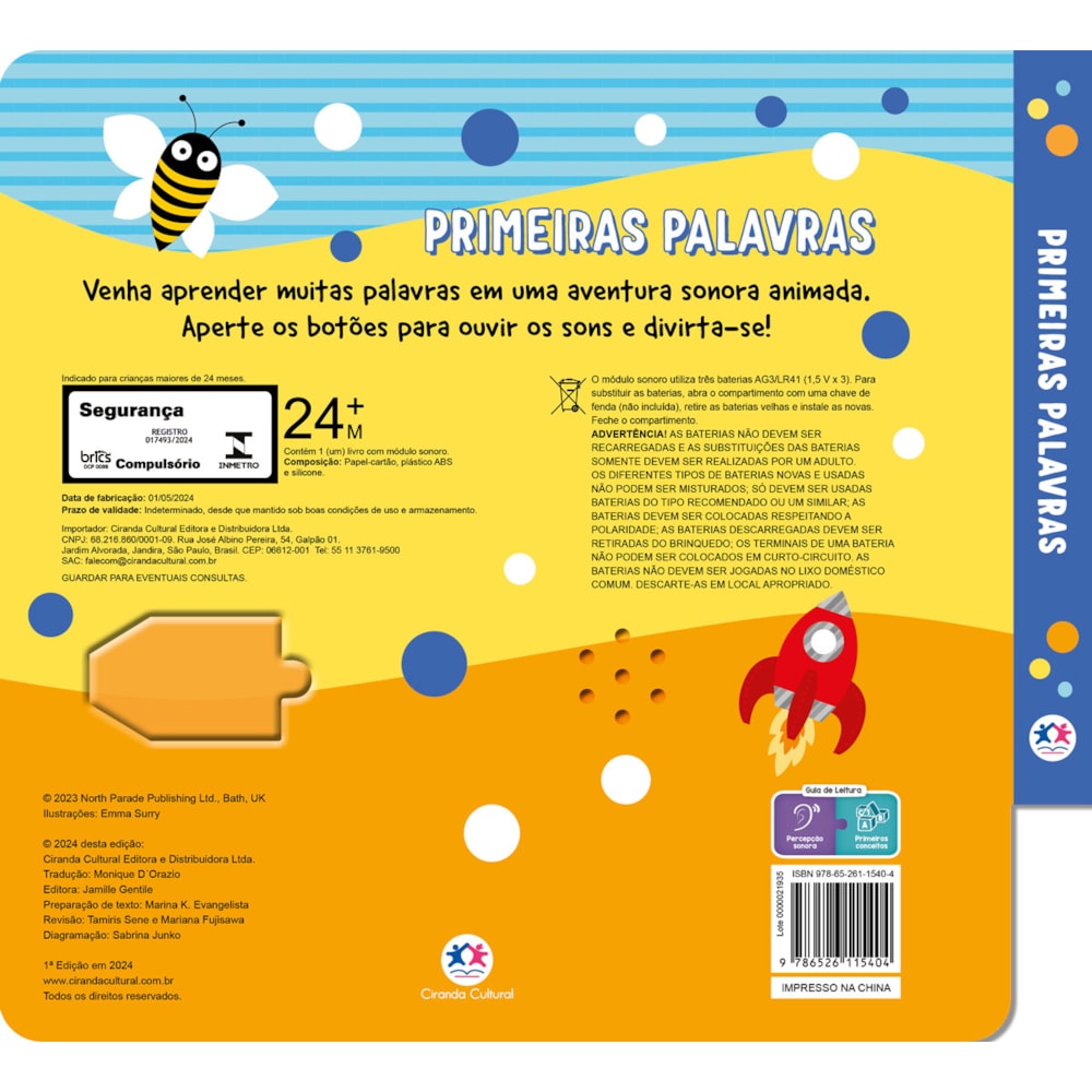 Venha aprender muitas palavras em uma aventura sonora animada. Aperte os botões para ouvir os sons e divirta-se! Com 5 sons incríveis para descobrir! Conheça as primeiras palavras e encontre o só da página do livro. Desperta a curiosidade e os primeiros conceitos, encantando com as cores vivas! E não se preocupe: se a bateria acabar, é só trocar e a diversão continua sem parar!