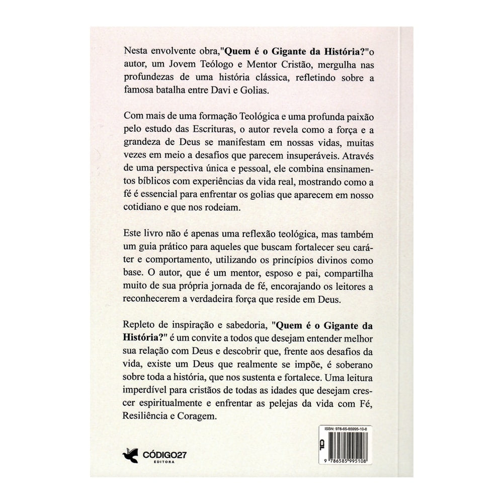 Em Quem é o Gigante da História?, o autor nos convida a revisitar a icônica batalha entre Davi e Golias sob uma nova perspectiva, não como um simples confronto entre um jovem pastor e um guerreiro temido, mas como um poderoso retrato da atuação divina em meio aos desafios humanos.