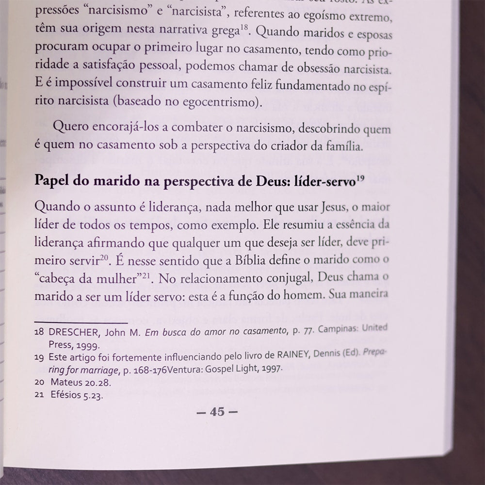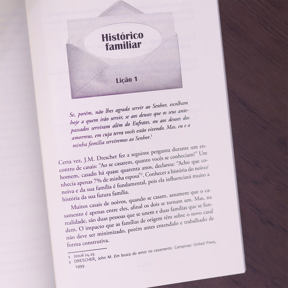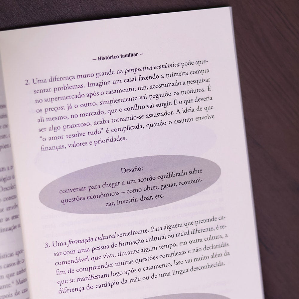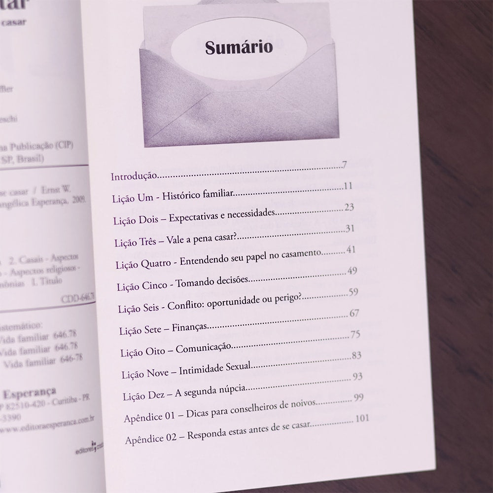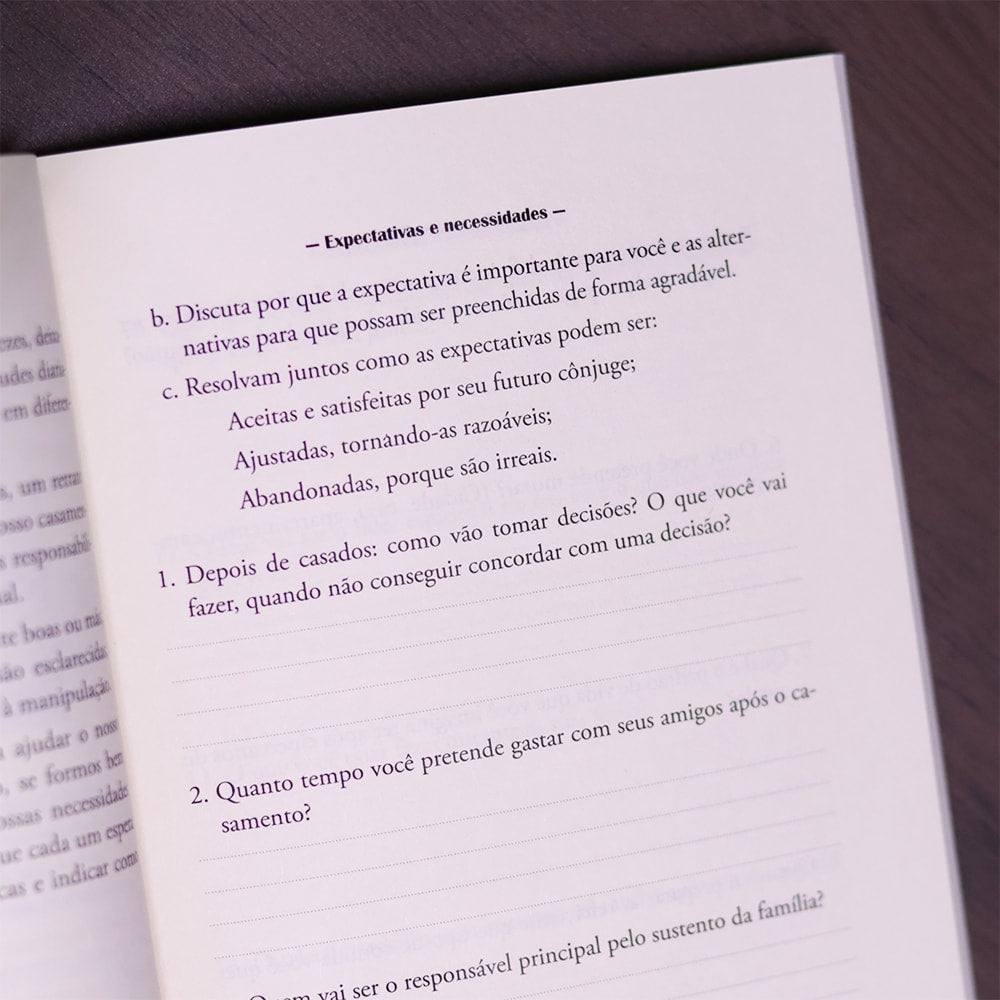 Cada capítulo do livro aborda um assunto principal desenvolvido em forma de perguntas com o objetivo de despertar a reflexão e o diálogo. A utilização deste material com vários casais de noivos resultou em conversas sobre vários assuntos relevantes, que até então não tinham sido abordados. Ao final de cada lição há um artigo que tem o intuito de fundamentar e sintetizar o tema discutido. Os capítulos podem ser trabalhados em uma ordem a ser definida de acordo com a necessidade ou interesse de cada um.