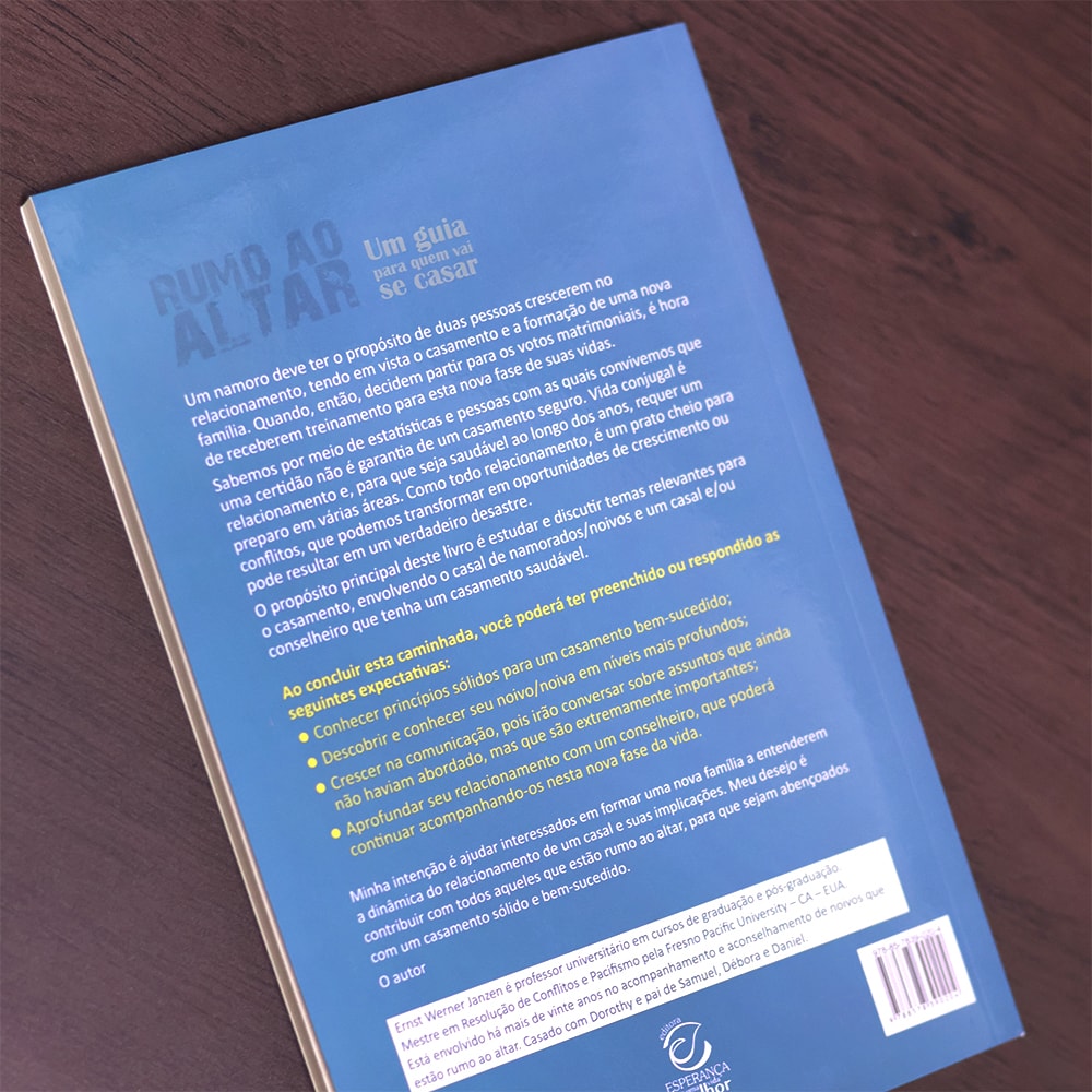 Além de ser um material para noivos, é também excelente para aqueles que simplesmente querem se aprofundar no assunto, ou para casais que querem investir em seu relacionamento. Minha intenção é ajudar conselheiros e interessados em formar uma nova família a entenderem a dinâmica do relacionamento de um casal e suas implicações. Meu desejo é contribuir com todos aqueles que estão rumo ao altar, para que sejam abençoados com um casamento sólido e bem-sucedido. Ernst Werner Janzen - Autor.