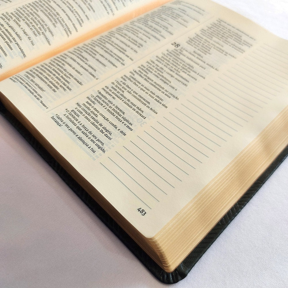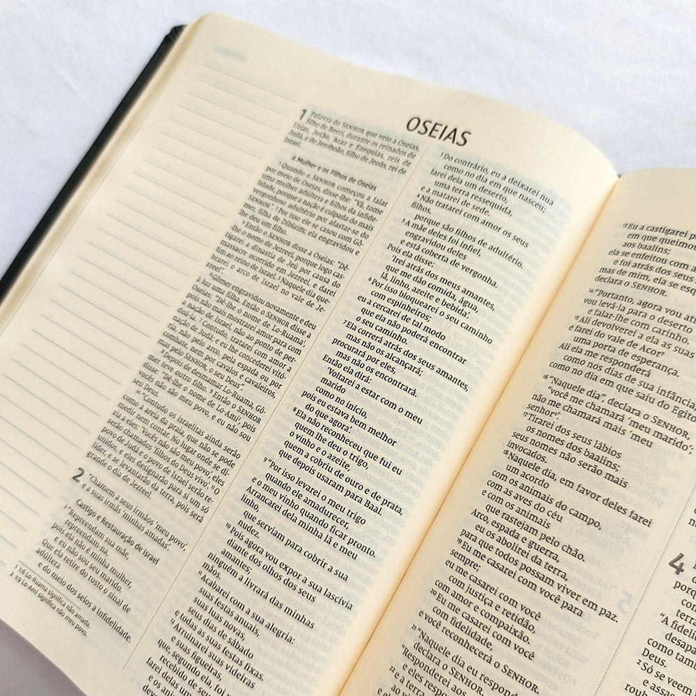 Quantas vezes estamos na igreja e ouvimos algo tão tocante que queremos registrar, mas não podemos porque não temos onde anotar? Você até gostaria de escrever na própria Bíblia, para que aquela informação complementasse seus estudos bíblicos, mas ela não tem espaço. Esta Bíblia chegou para resolver esse problema. Pensada para você que gosta de registrar comentários e anotações que enriqueçam a compreensão do texto bíblico. Com papel diferenciado que dá mais destaque às anotações e mais visibilidade ao texto, graças à fonte Leitura Perfeita, especialmente desenvolvida pela Thomas Nelson Brasil, esta é a ferramenta ideal para aqueles que desejam aprofundar seu relacionamento com a Palavra.