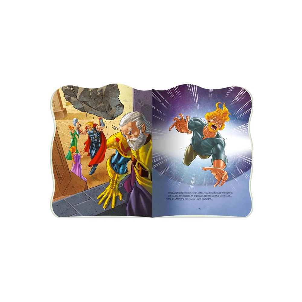 Thor é o príncipe e o maior guerreiro do seu reino, Asgard. Graças a seu martelo mágico, ele tem o poder de controlar raios e trovões. Um dia, como castigo por ter ficado um pouco arrogante, seu pai o envia à Terra como um mortal sem memórias. Conheça a história do herói neste livro cheio de ação e aventura!