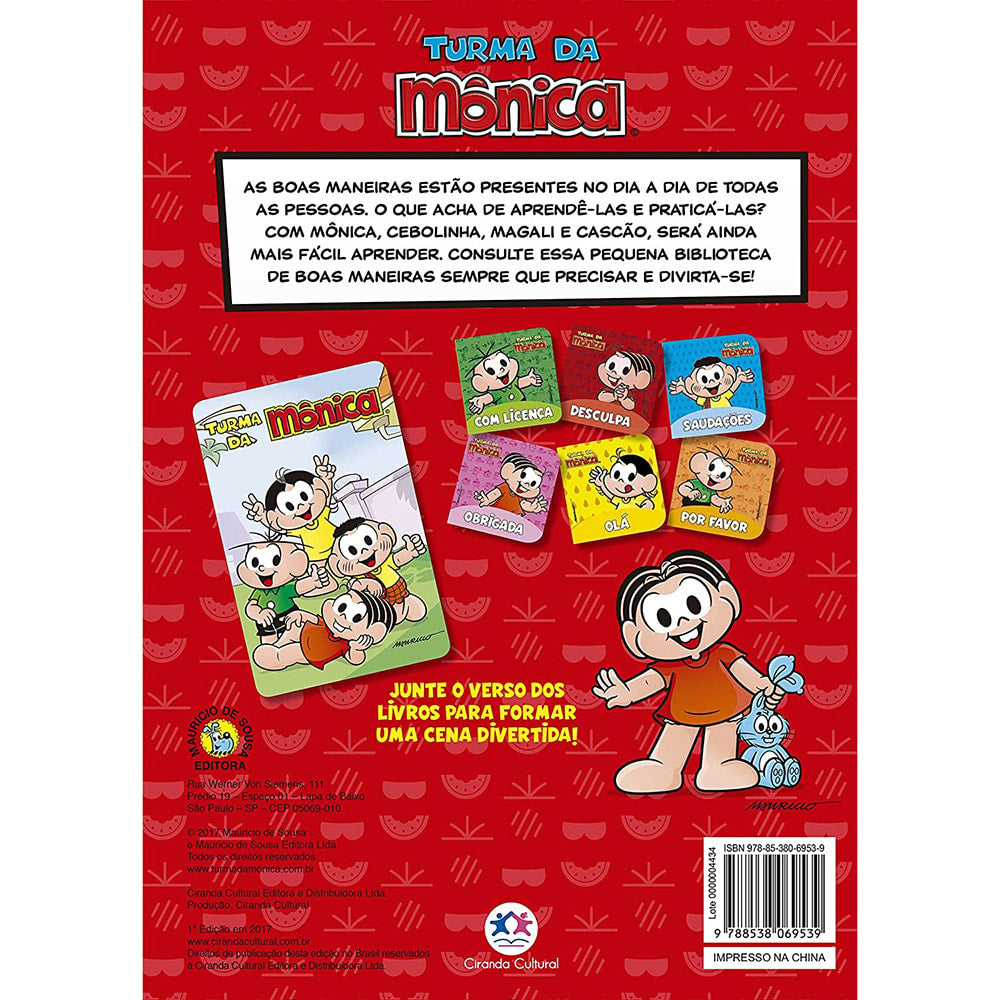 As boas maneiras estão presentes no dia a dia de todas as pessoas. O que acha de aprendê-las e praticar? Com a Mônica, o Cebolinha, a Magali e o Cascão, será ainda mais fácil aprender. Consulte essa pequena biblioteca de boas maneiras sempre que precisar e divirta-se! Junto o verso dos livros para formar uma cena divertida!