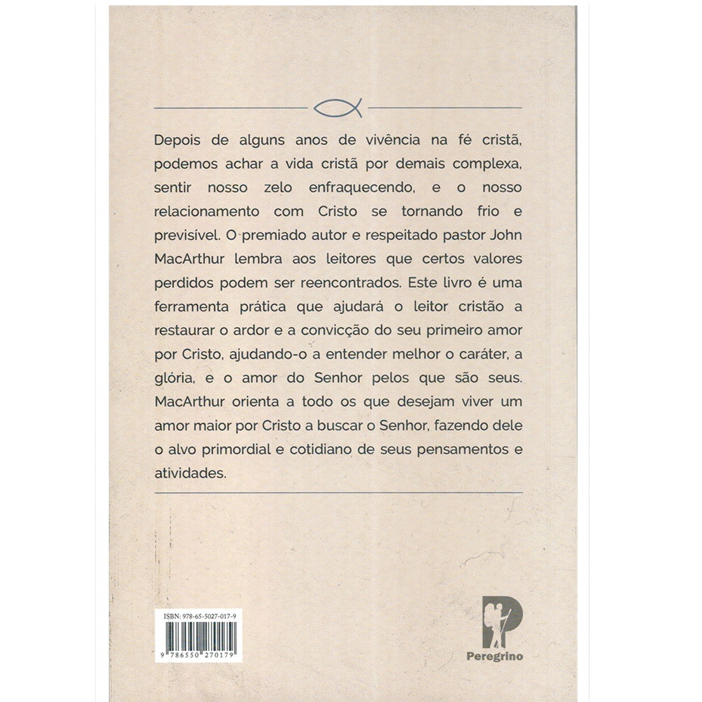 Depois de alguns anos de vivência na fé cristã, podemos achar a vida cristã por demais complexa, sentir nosso zelo enfraquecendo e o nosso relacionamento com Cristo se tornando frio e previsível. O premiado autor e respeitado pastor John MacArthur lembra aos leitores que certos valores perdidos podem ser reencontrados. Este livro é uma ferramenta prática e ajudará o leitor cristão a restaurar o ardor e a convicção de seu primeiro amor por Cristo, ajudando-o a entender melhor o caráter, a glória e o amor do Senhor pelos que são seus. MacArthur orienta a todo os que desejam viver um amor maior por Cristo a buscar o Senhor, fazendo dele o alvo primordial e cotidiano de seus pensamentos e atividades.