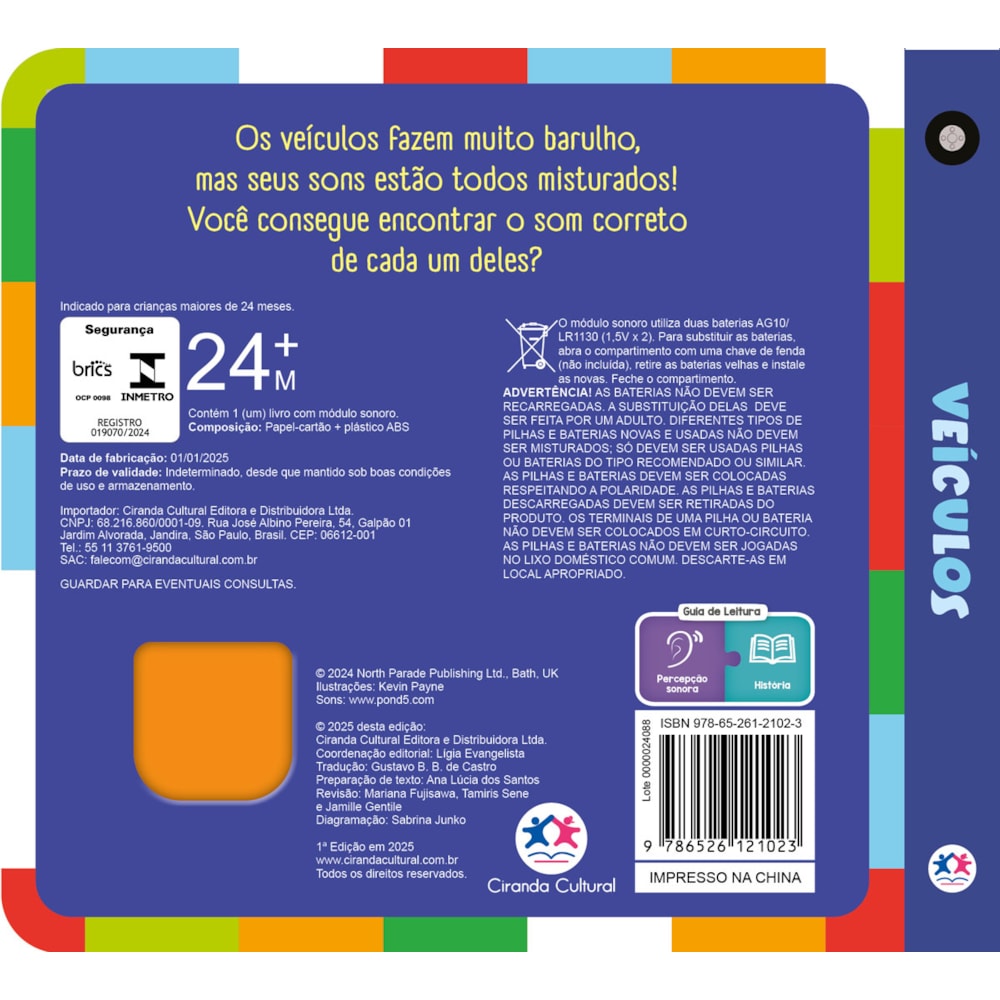 Os veículos estão fazendo o maior barulhão — mas que confusão! Será que você consegue descobrir qual som pertence a cada um? Carros, caminhões, tratores e muitos outros estão com os ruídos todos embaralhados! Neste livro interativo e cheio de cores, os pequenos vão se divertir apertando os botões e combinando os sons com os veículos certos. Ah, e quando a bateria acabar, é só trocar — a diversão continua sem parar!