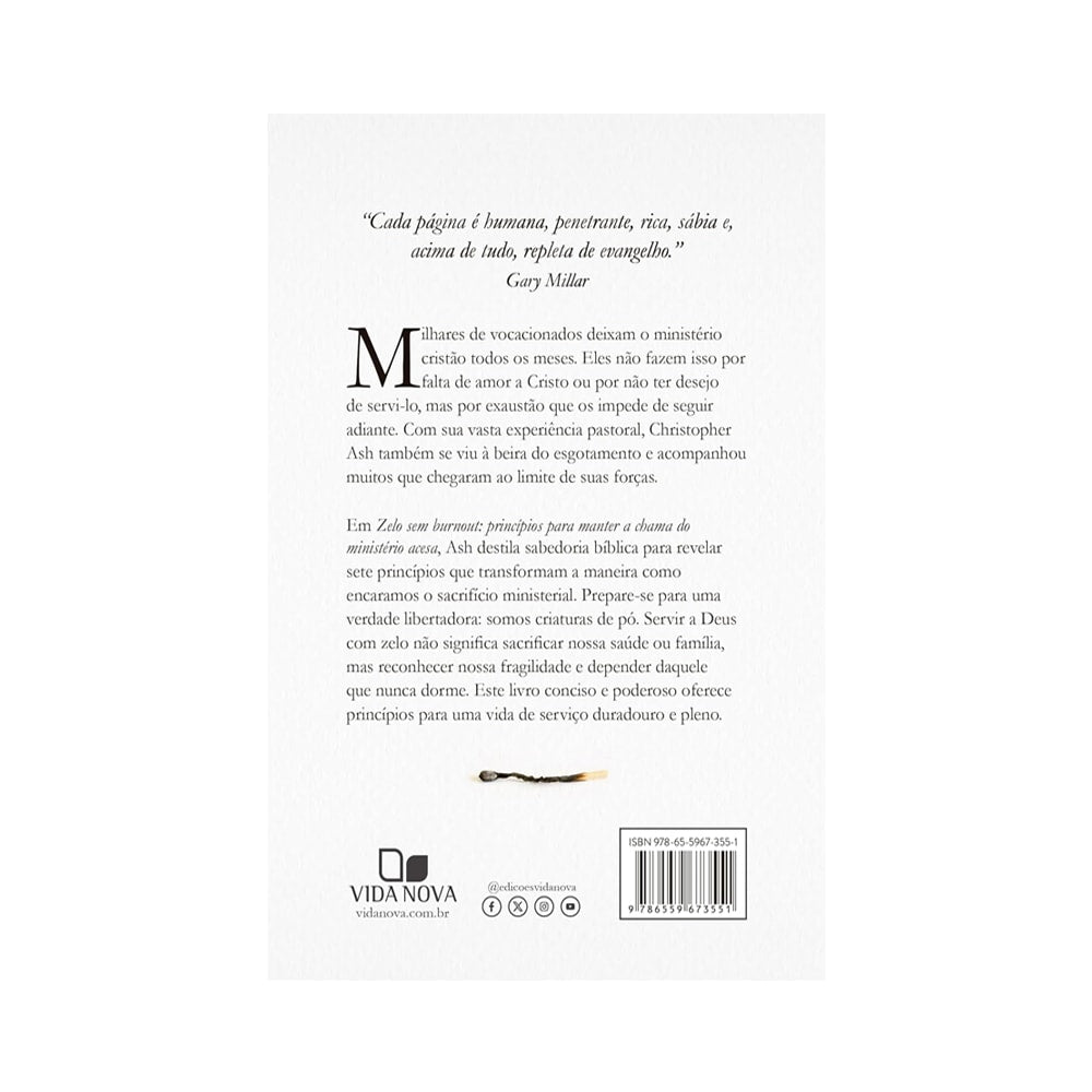 O livro Zelo sem burnout, de Christopher Ash, trata da exaustão que leva muitos vocacionados a deixarem o ministério cristão, não por falta de amor a Deus, mas por desgaste físico e emocional. Com base em sua experiência pastoral, Ash apresenta sete princípios bíblicos que ajudam a manter o zelo no ministério sem sacrificar a saúde ou a família. A principal lição é reconhecer nossa fragilidade como criaturas humanas e depender de Deus para um serviço duradouro e equilibrado.